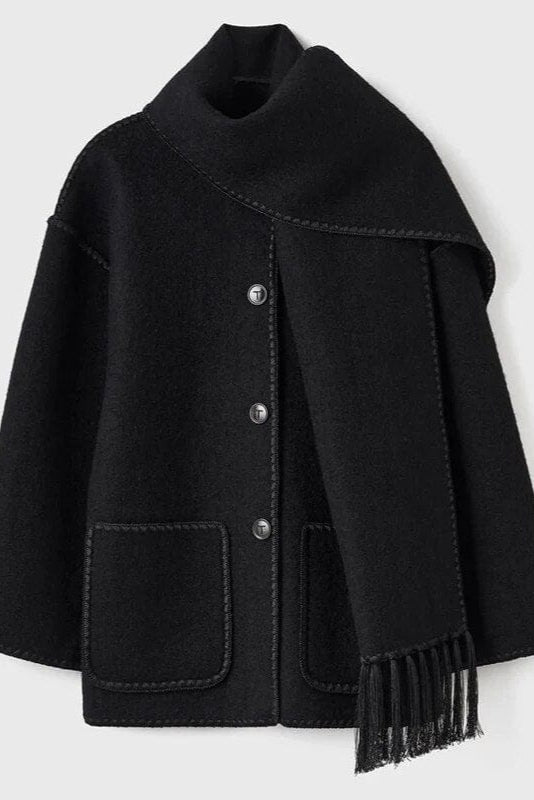 - Bufanda de flecos incorporada para mayor calidez e interés visual