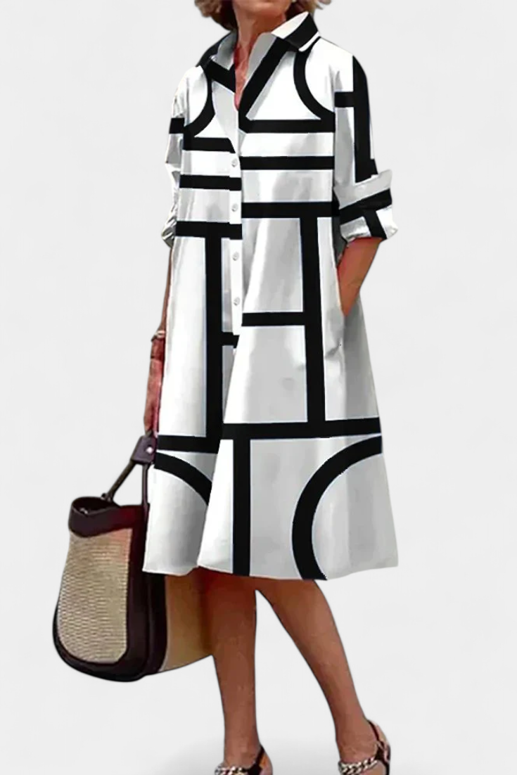 Destaca con estilo con Larissa, un vestido camisa que fusiona sastrería clásica con un audaz estampado en blanco y negro. Confeccionado en una mezcla ligera de algodón y seda fría, su tacto suave y fresco acompaña tus días con comodidad y distinción, ideal para looks versátiles que combinan arte y funcionalidad.